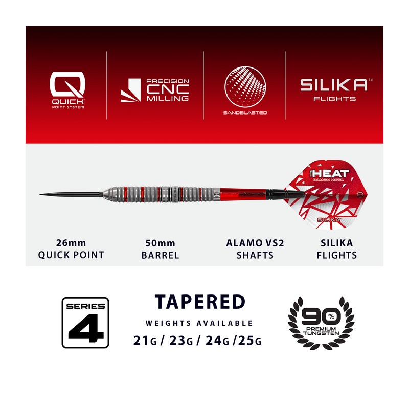 taying true to Damon’s trusted tapered barrel profile, the Series 4 introduces carefully positioned ring cuts to increase grip consistency, paired with a precision sandblasted texture between cuts for superior feel under pressure. The dart’s nose features five lateral milled cuts, providing a reliable reference point, promoting repetition on every throw.