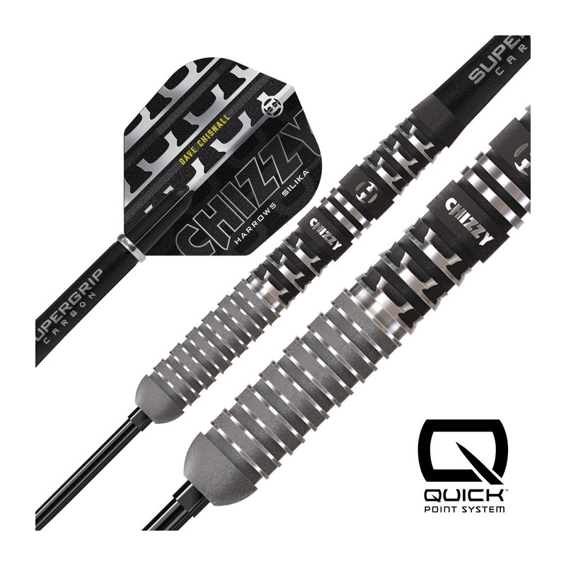 Dardos Harrows Chizzy Series 4 punta de acero. Este dardo de 90 % tungsteno. Dardo de perfil parallelo con cortes fresados estilo Geo. Incorporando la tecnología Quick Point, permiten a los jugadores ajustar la longitud y el estilo de la punta en segundos. Cada dardo está recubierto con un resistente nitruro de titanio negro y pulido con chorro de arena para mejor sensación y consistencia.