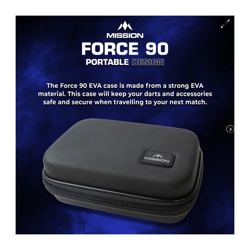 Bolsa para Dardos Mission Force 90 em EVA Moldado - Grande. Feito de material EVA durável, este estojo manterá os seus pences e acessórios organizados. Este estojo comporta dois conjuntos de dardos totalmente montados, bem como um compartimento para guardar penas sobressalentes da Mission Force 90. Dardos e penas não incluídos.