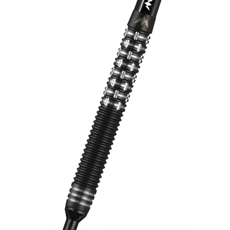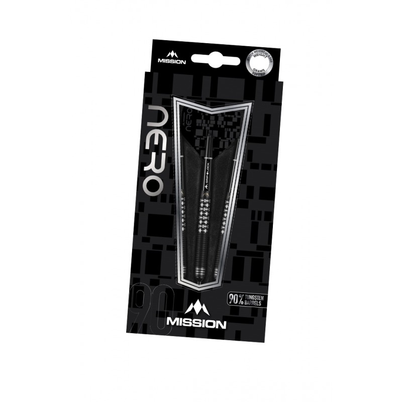 Os dardos Mission Nero apresenta um cilindro reto com ranhuras radiais variadas por toda parte. O revestimento PVD durável de nitreto de titânio foi submetido a nova usinagem com ranhuras radiais adicionais e cortes paralelos fresados alternados em toda a parte traseira do cilindro.