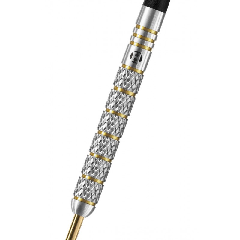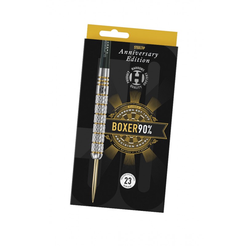Dardos Harrows Boxer Parallel de ponteira de aço. Lançados em 1994, os dardos Boxer 90% são um dos mais icônicos já lançados pela Harrows. Os dardos Boxer combinam serrilhados de precisão com anéis de corte limpo para dar ao jogador uma aderência única e consistente. Revestido com nitreto de titânio dourado resistente.